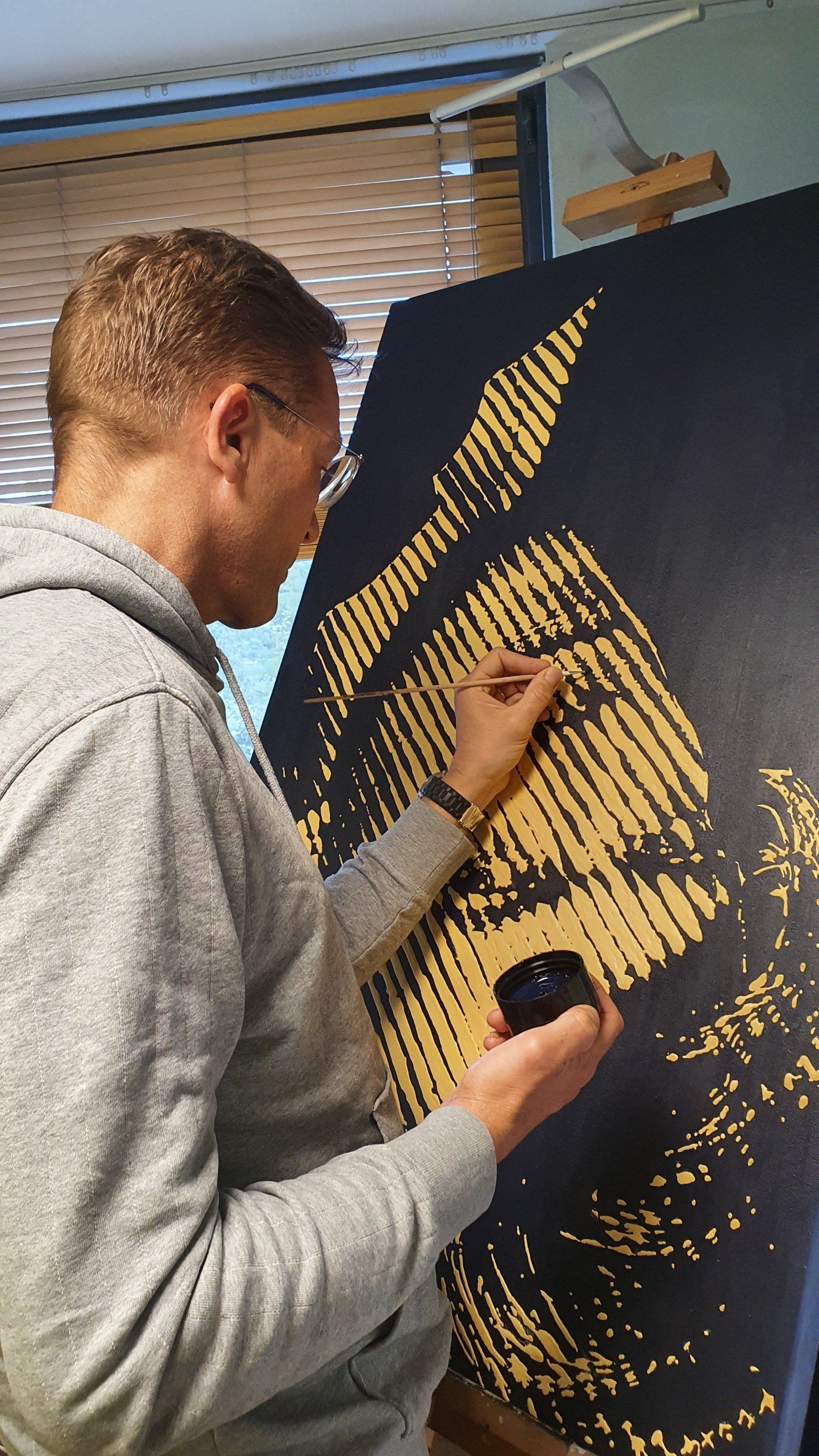 Details: 80x120x5cm, Acrylic-on MDF, Yellow-on-Blue
