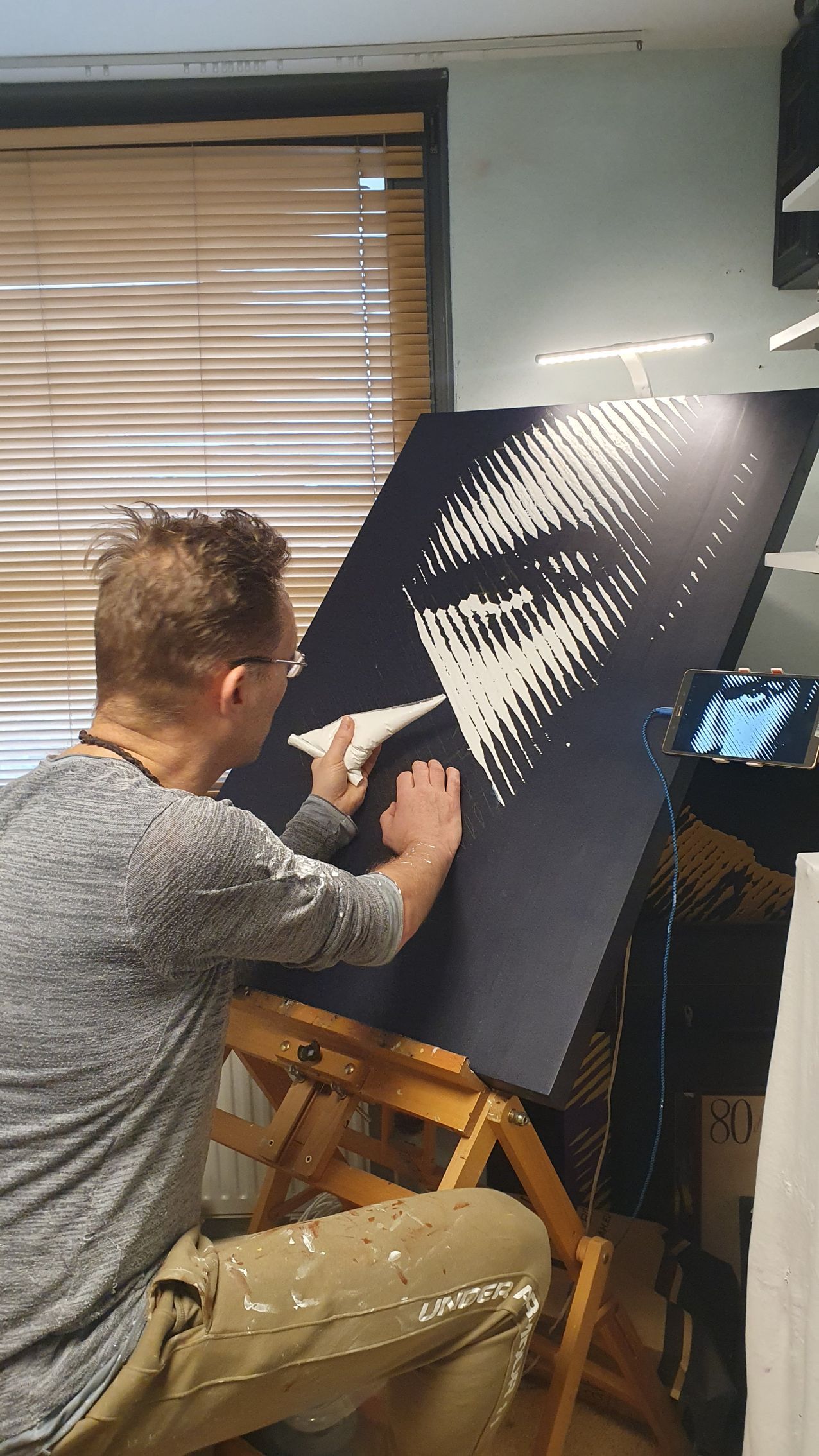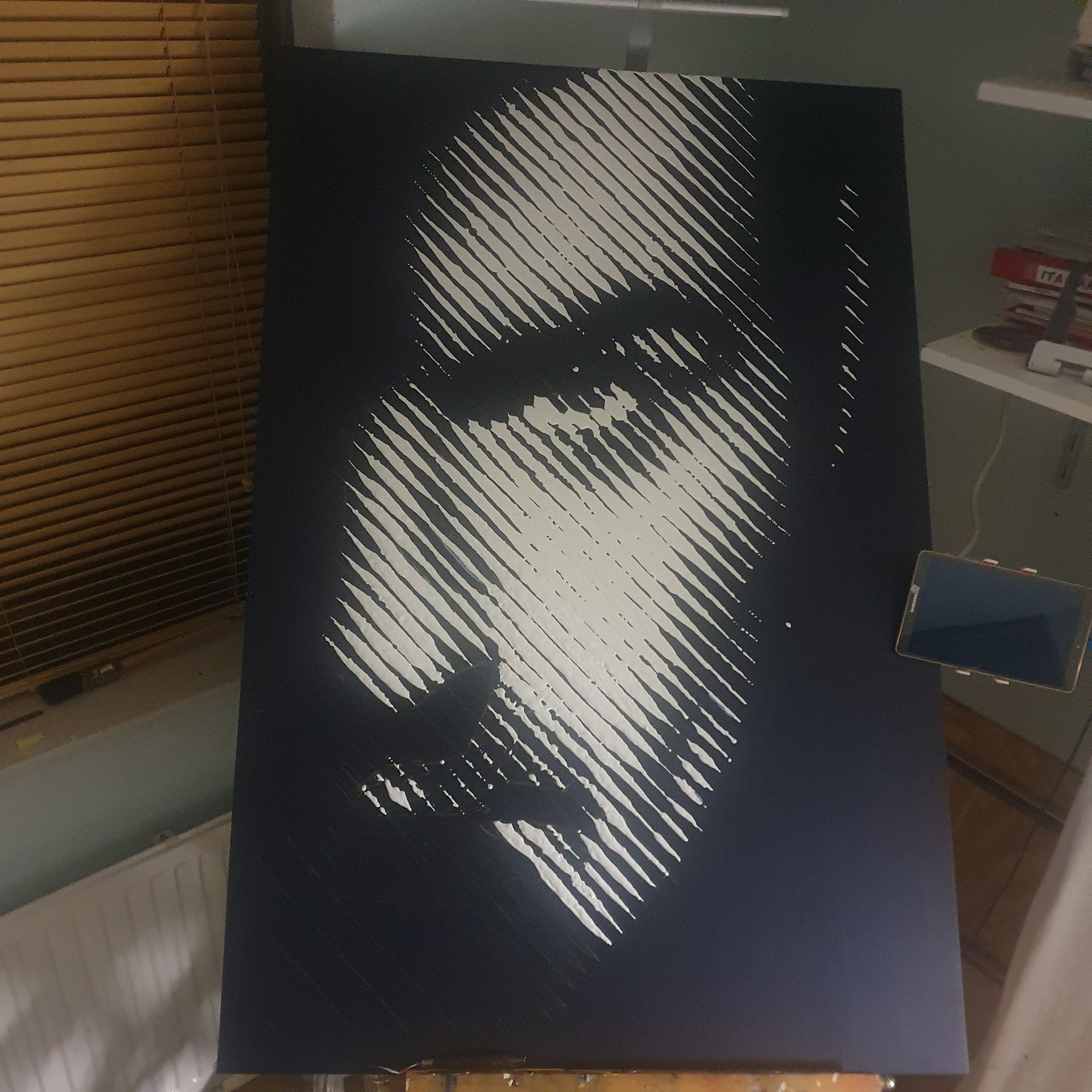 I decided to do this one as close up and rough as possible. Thick lines like the Vito Corleone painting, but taking it even one step further. The half-face of his Older album. Iconic image, great to catch that look in as less lines as possible!