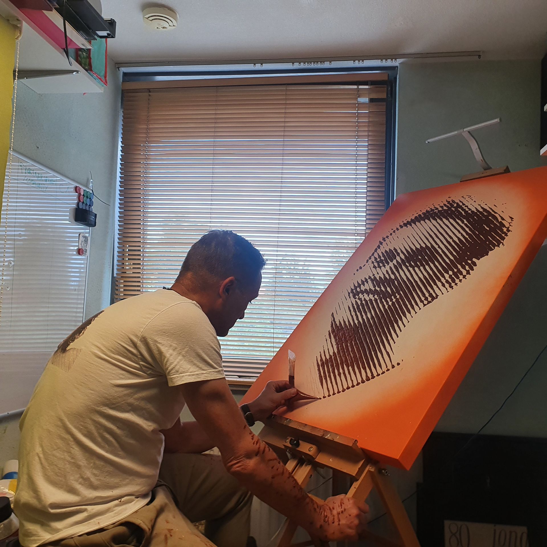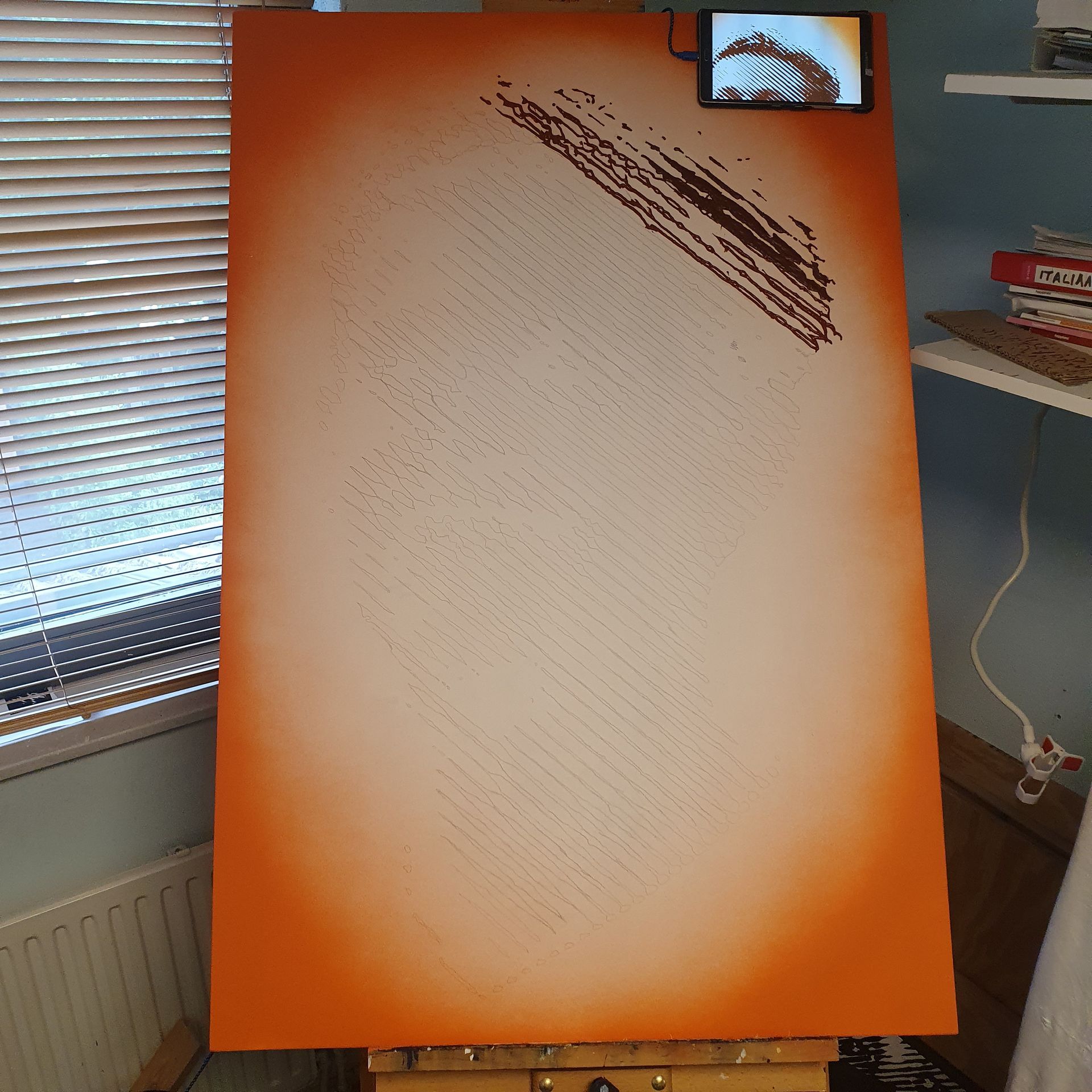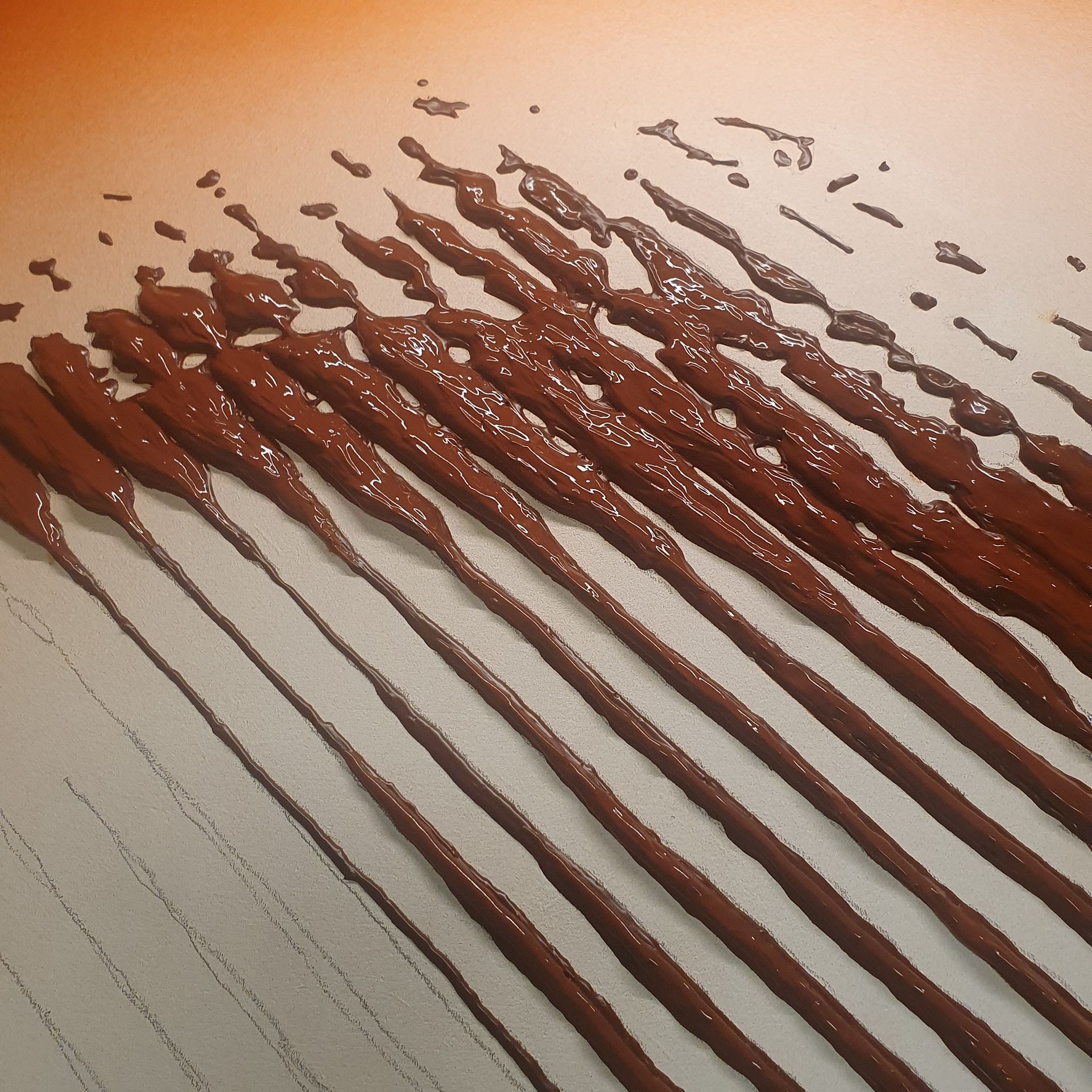 Details: 80x120x5cm, Acrylic-on MDF, Brunt Sienna on White/Orange