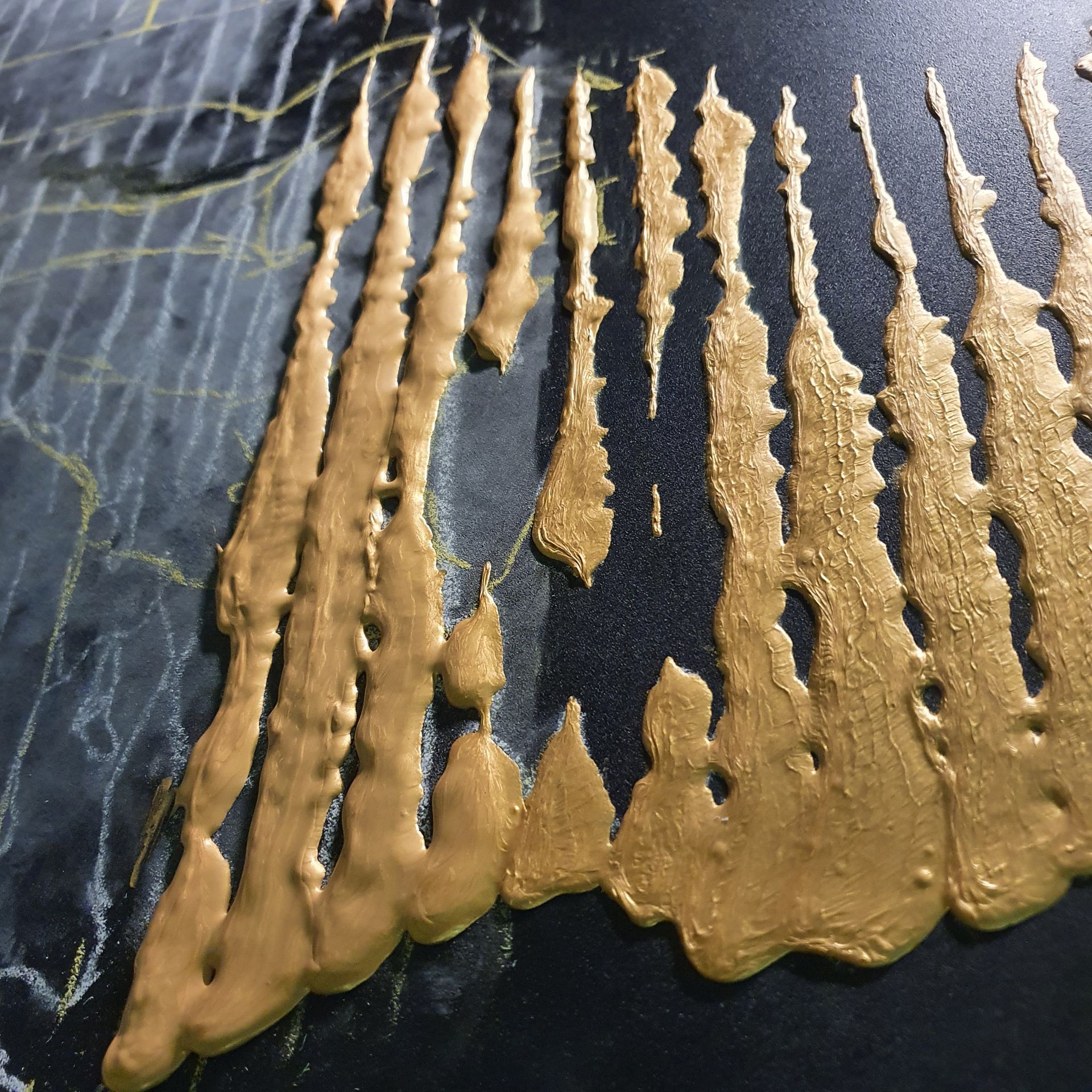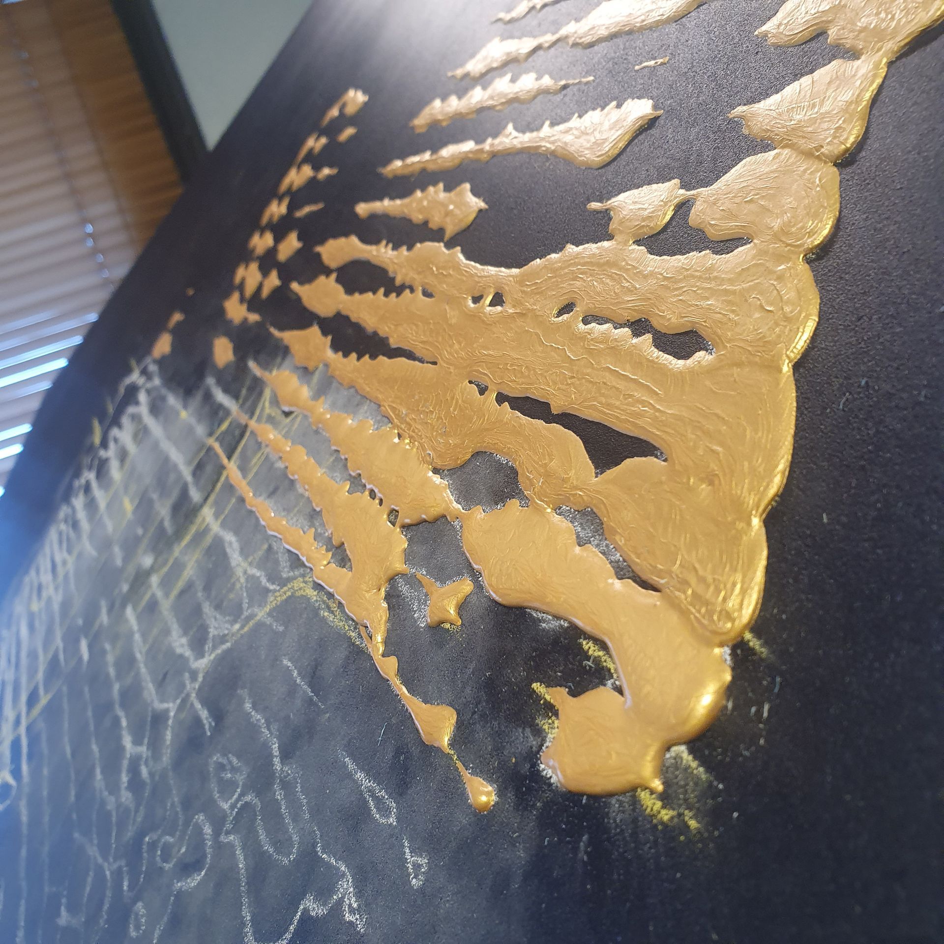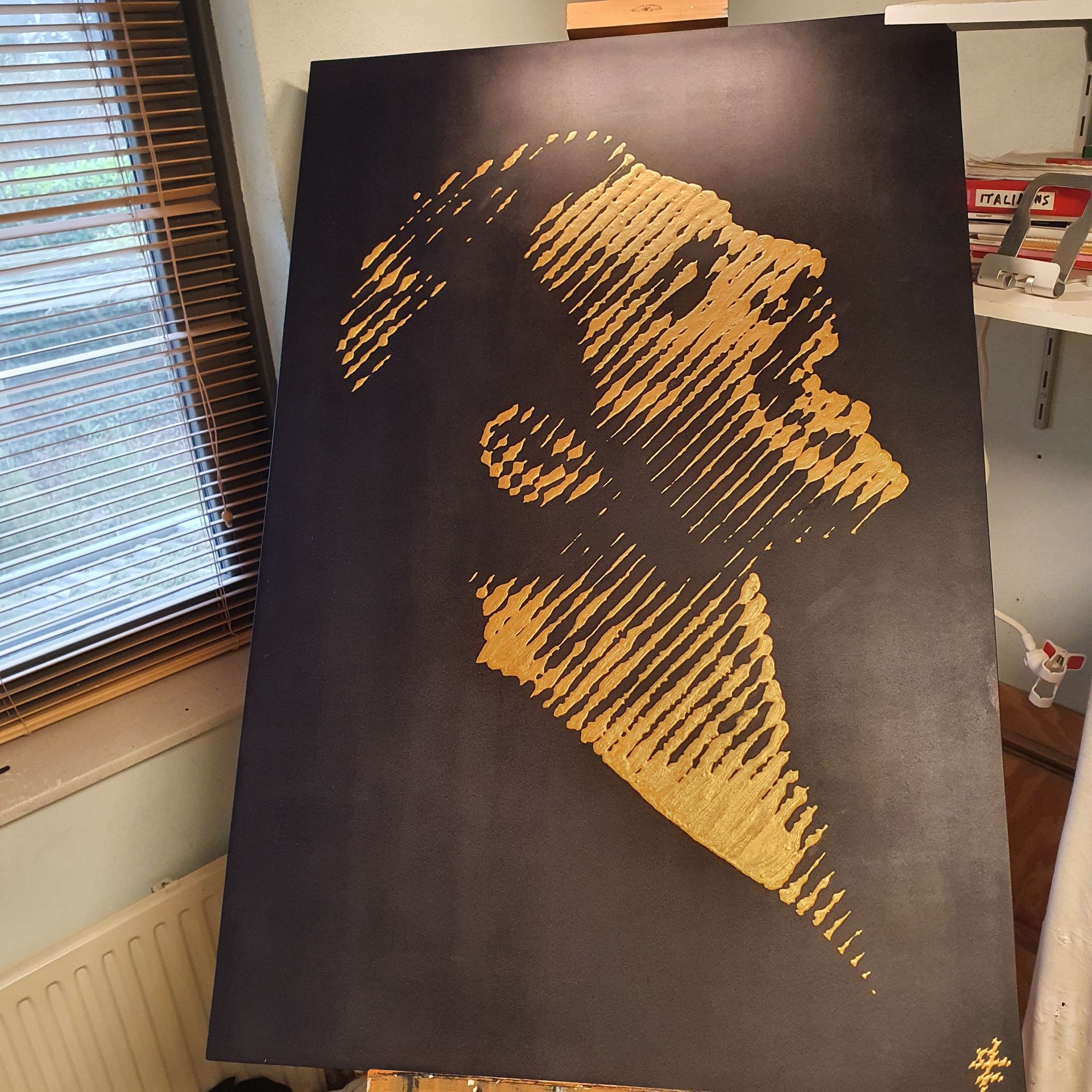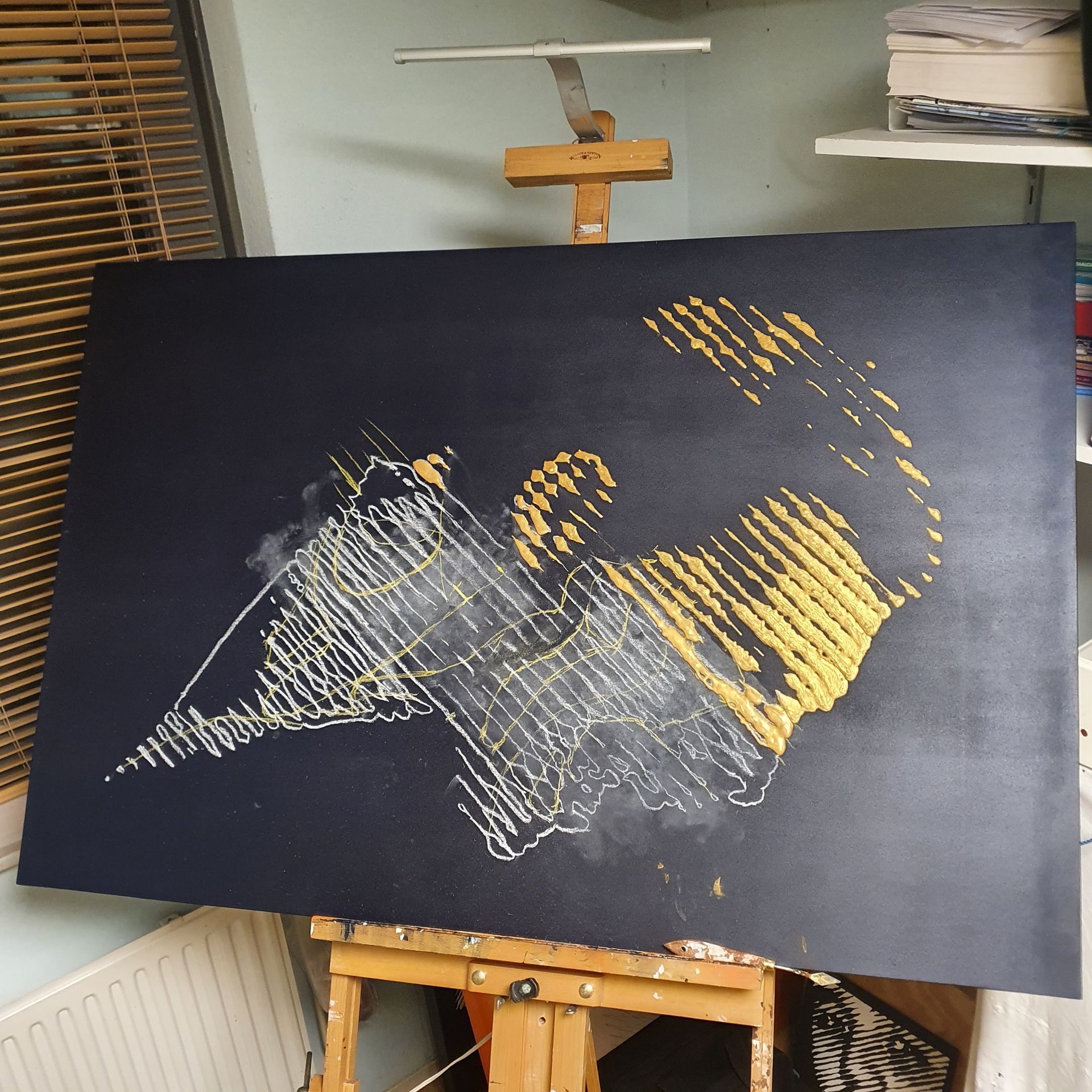 Details: 80x120x5cm, Acrylic-on MDF, Light Gold on Blue