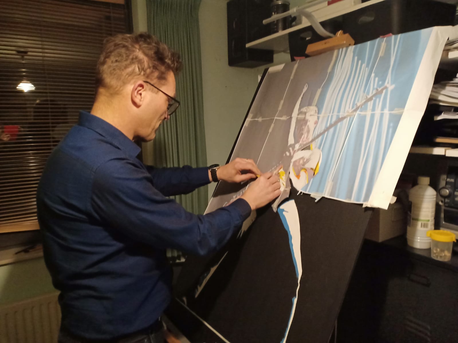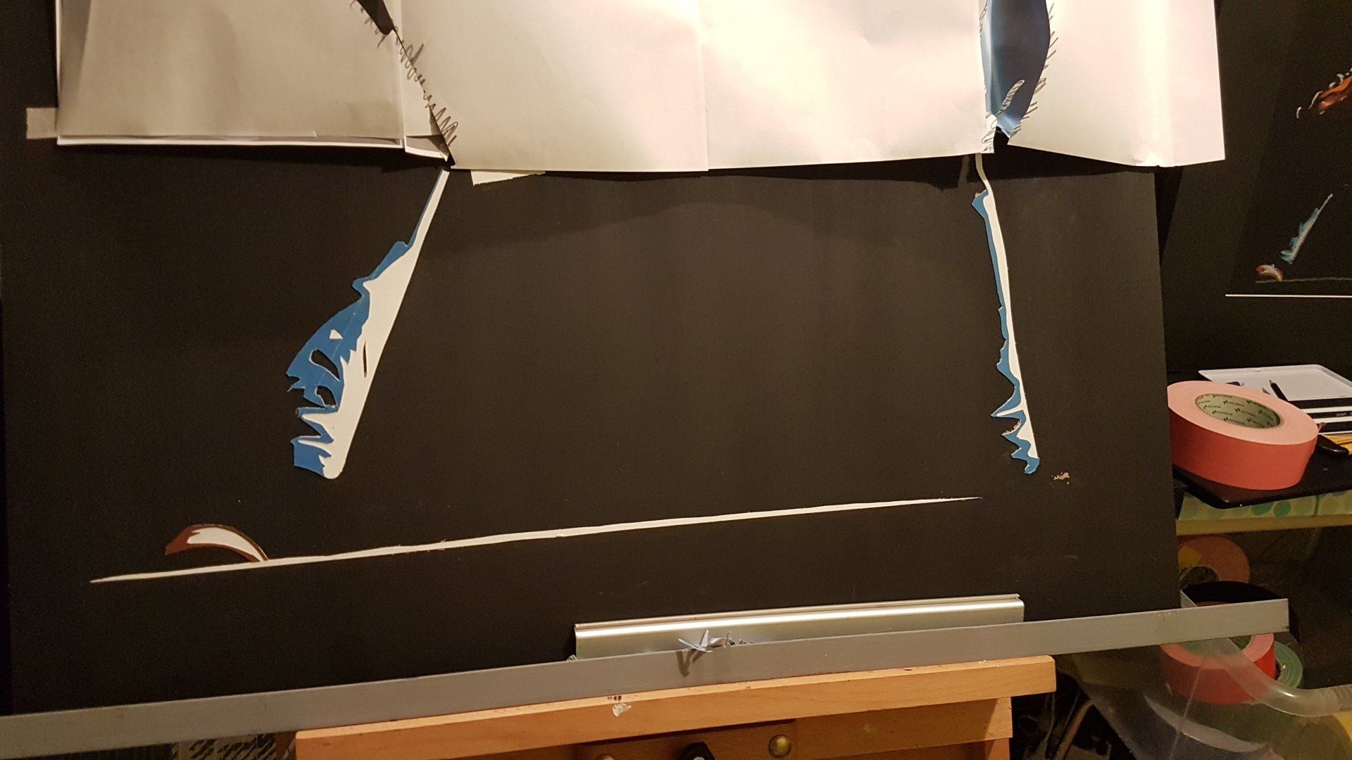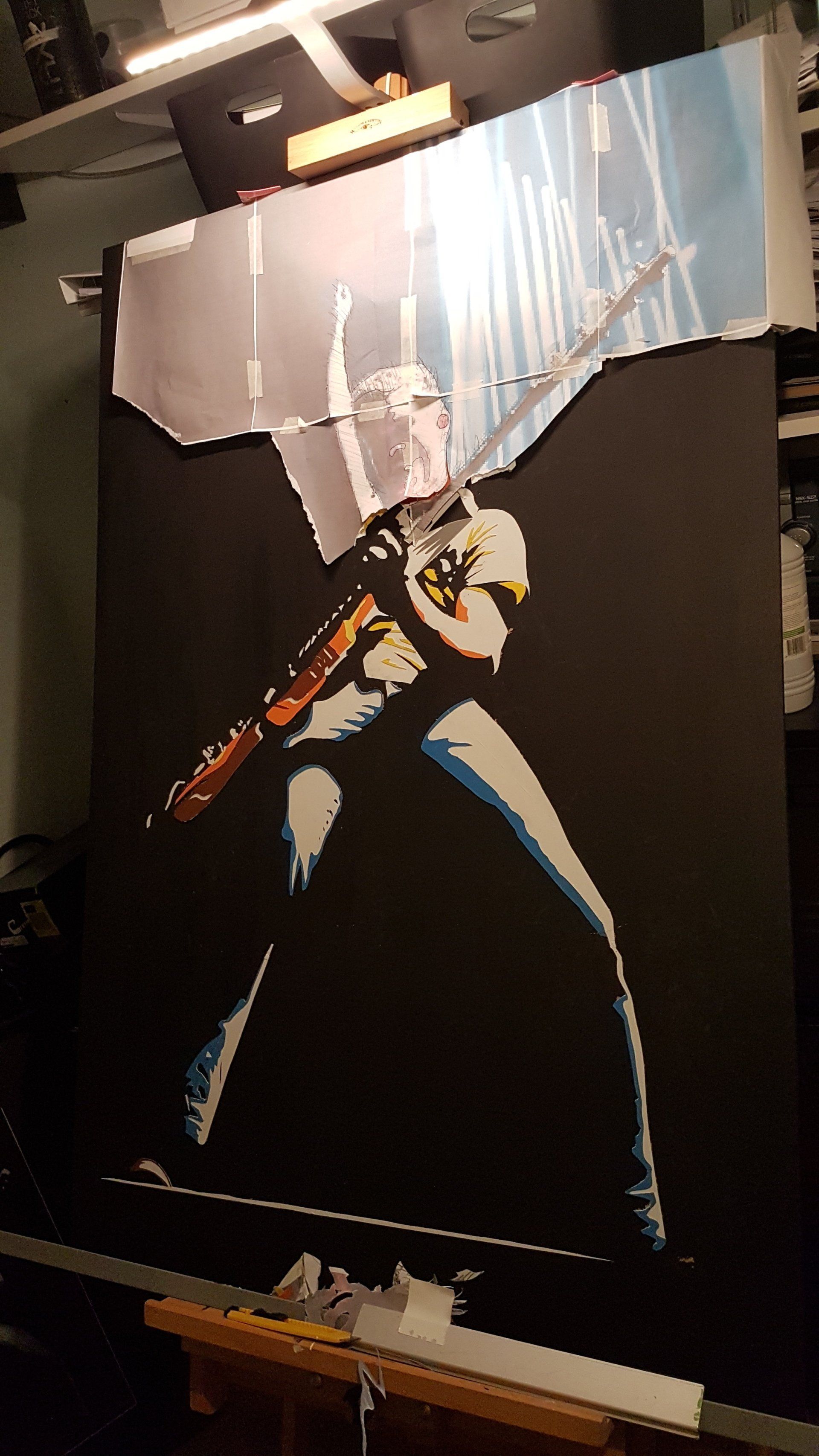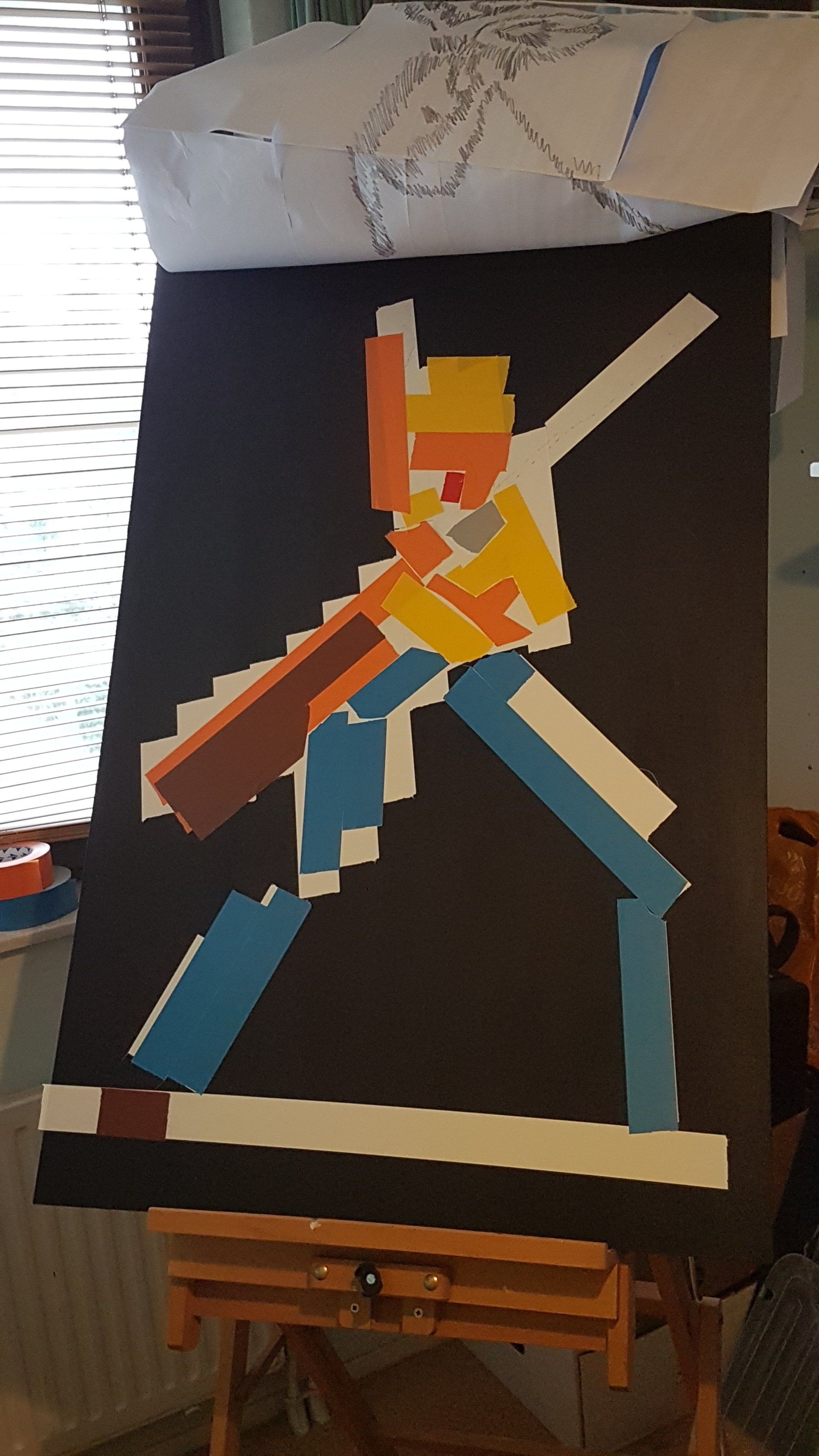 What a powerful pose. You almost hear the noise of the guitar by just looking at this! I first did this image on in smaller format with oil pastels. I still wanted to make it bigger and more impactful with the white more contrasting: really 100% white. No better way than to do this with tape!